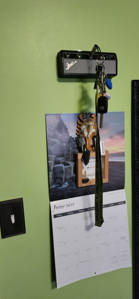 Little Leary of the sturdiness using my 3m Command Strips. Seems to be working out fine though. And on paneling at that! I got sick of my keys laying around and this is perfect for any Fender fan. The plugs do come loose once in awhile, but you can use a small amount of blue Loctite or finger nail polish dab on the threads is that’s a problem.